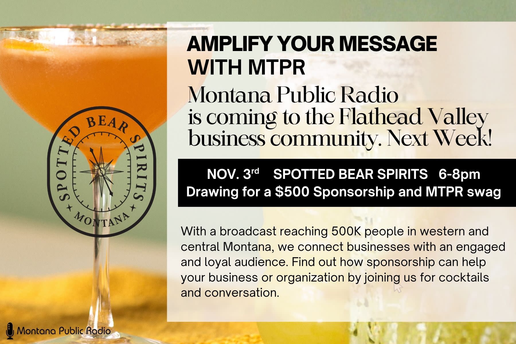 Montana Public Radio will visit Flathead Valley on November 3rd to connect with businesses interested in reaching 70,000 engaged listeners at Spotted Bear Distillery from 6 to 8 PM or schedule a one-on-one meeting to explore sponsorship opportunities.