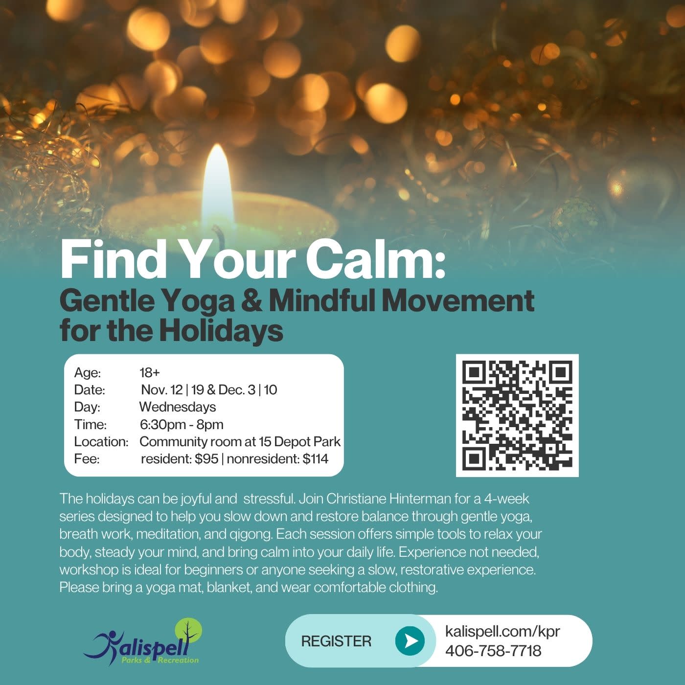 The holidays can be a joyful yet demanding time, often leaving us feeling busy, overwhelmed, or emotionally stretched. Join Christiane Hinterman for a restorative 4-week series that offers a chance to slow down and find balance through mindful movement and relaxation. Each session gently guides you through practices such as yoga, breath work, guided meditation, and qigong—helping you reconnect with your body, steady your mind, and nurture inner peace. You’ll leave each class with simple tools to soothe the nervous system and carry calm in your daily life and throughout the holidays. This class is suited for beginners or those who desire a slow – restorative experience. Wear comfortable clothes and bring a yoga mat and blanket.