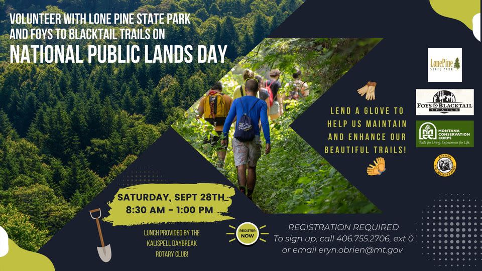 Join celebrating National Public Lands Day by giving back to the beloved trails! Kick-off is at 8:30 AM at North Foy's Lake Access with introductions and a safety talk, then split into teams to tackle trail maintenance at Lone Pine State Park and Foys to Blacktail Trails.